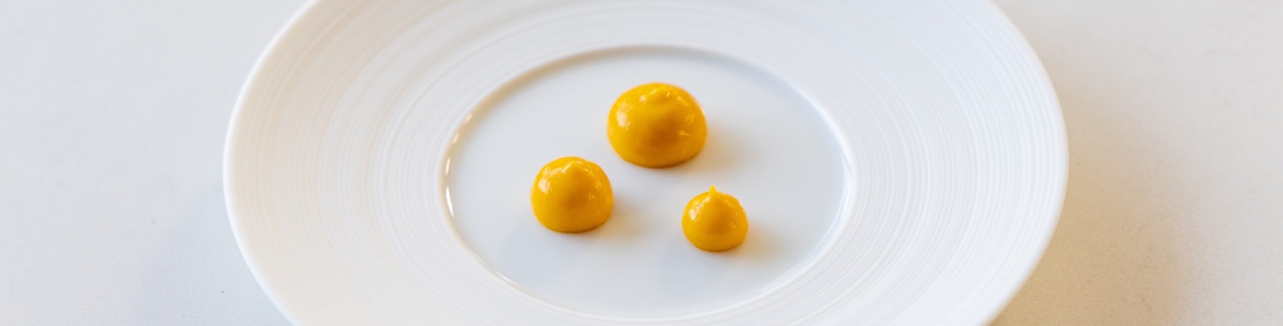 First cut the butternut squash in half and remove the seeds. Then cut a cross pattern in both sides. Now season the flat sides with some salt and drizzle some oil on top. Then turn them around on a tray that’s lined with a silicon sheet and bake them at 200 degrees Celsius for 1 hour. Let them cool down for a couple of minutes and remove the cooked meat. After that cut the shallots in half and clean them. Now chop them. Then add a drizzle of oil to a hot pan and glaze the shallots on a medium heat. Once glazed add the butternut squash and pan fry this for a couple of minutes. Then deglaze the pan with the vegetable broth and the cream. Now reduce all the liquid on a low heat. Stir it every now and then to prevent it from burning. Once it’s reduced transfer it into a blender and blend it till smooth. Then add a knife tip of Xanthan powder and blend it for another minute. This will prevent the cream from splitting later on. Keep it in your fridge for later.