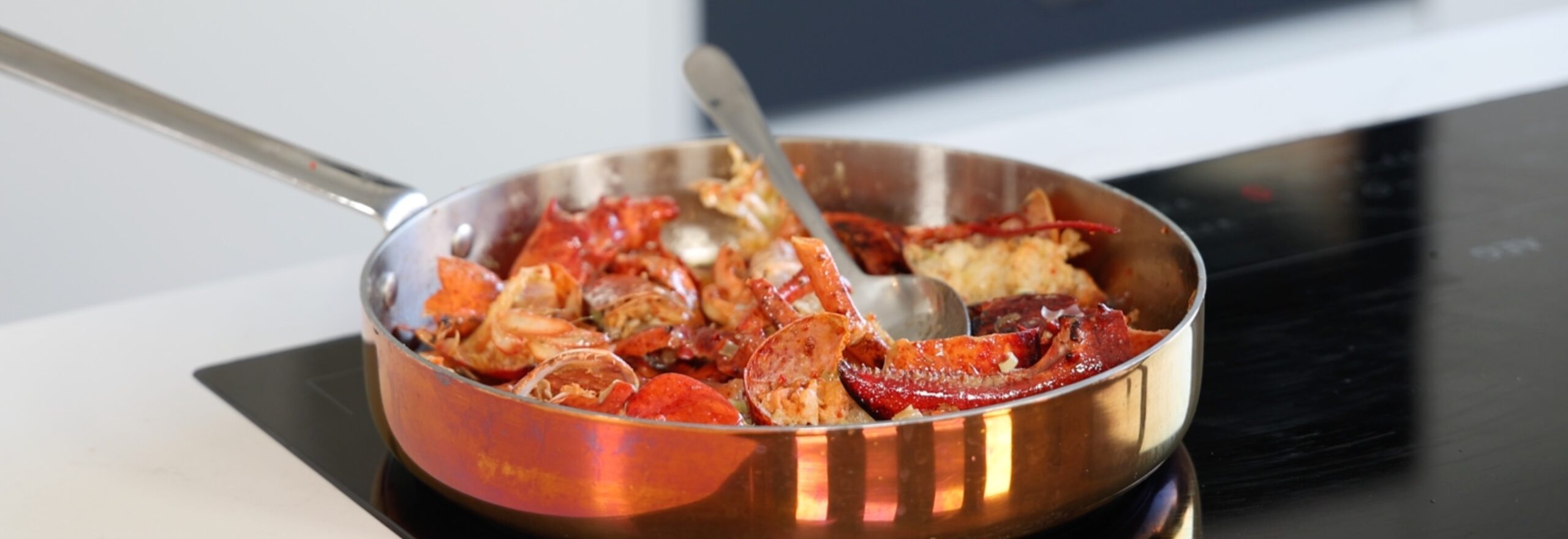 Take the lobster head and chop it in small pieces. Now add a drizzle of oil to a hot pan and pan fry the lobster head and trimmings on a high heat till it starts to color. When that has happened add the butter and turn down the heat to a minimum. Then cut the lemongrass fine and add it to the pan as well. Mix it well and then let it marinade on the lowest heat for at least 40 minutes. Mix it every now and then. Once that’s done pass it through a fine sieve that’s lined with a kitchen paper to clarify it.